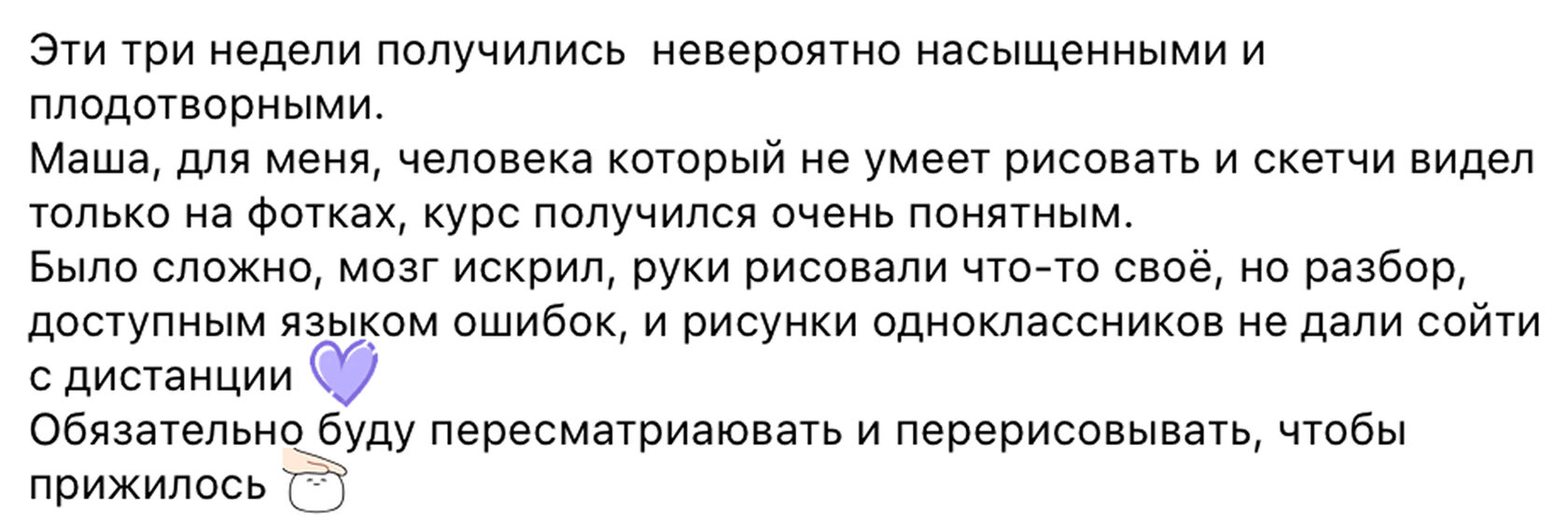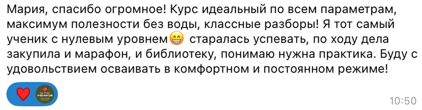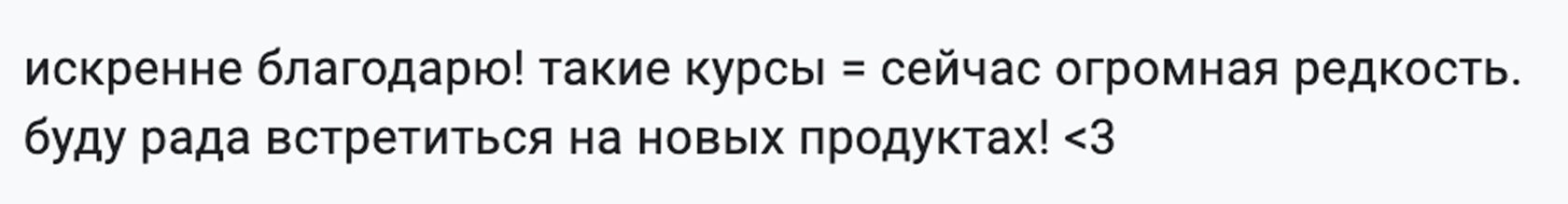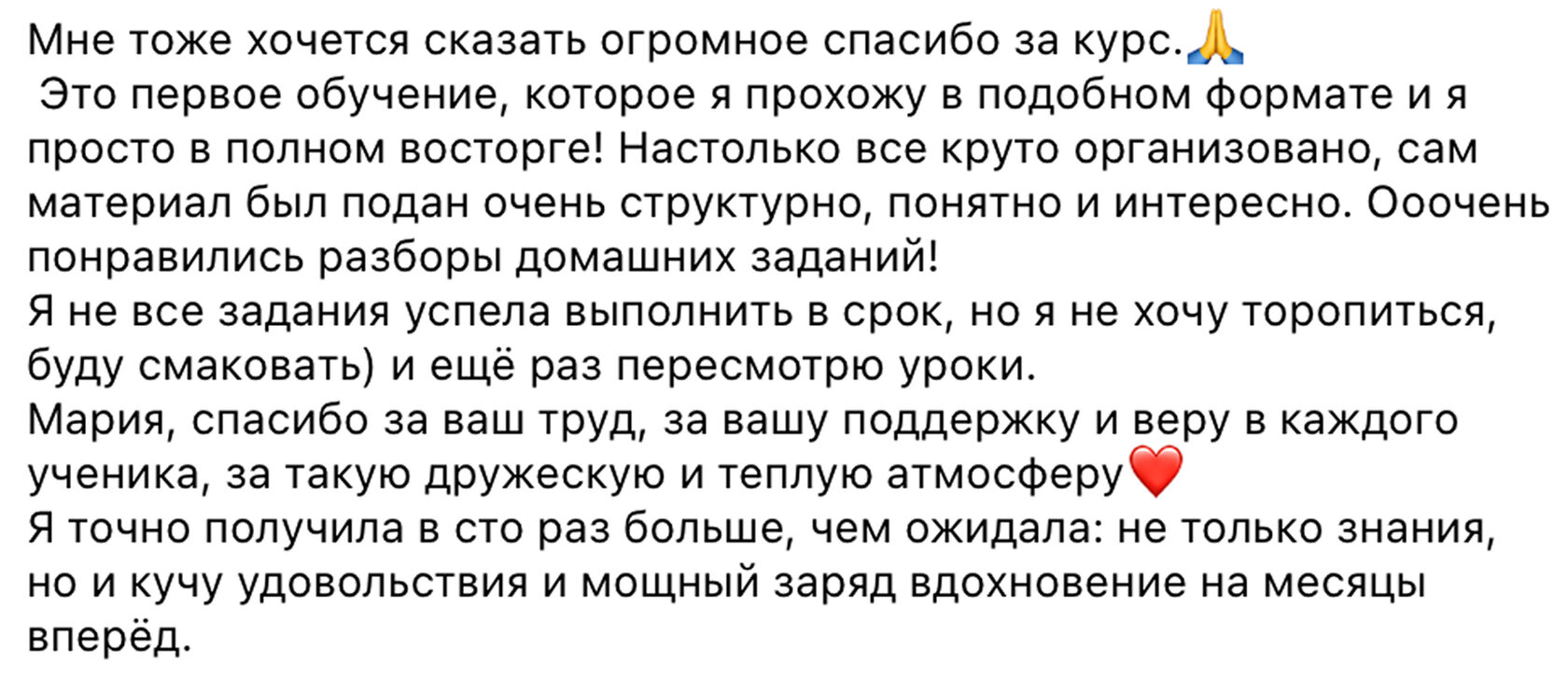 Я�намеренно сделала этот поток еще дольше, чтобы вы�могли пройти уроки в�спокойном темпе. Также доступ к�курсу останется у�вас без ограничений по�сроку�— вы�можете проходить уроки в�удобное для вас время.�